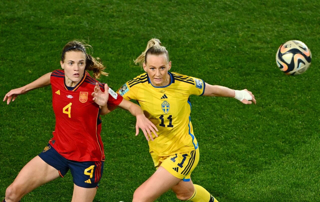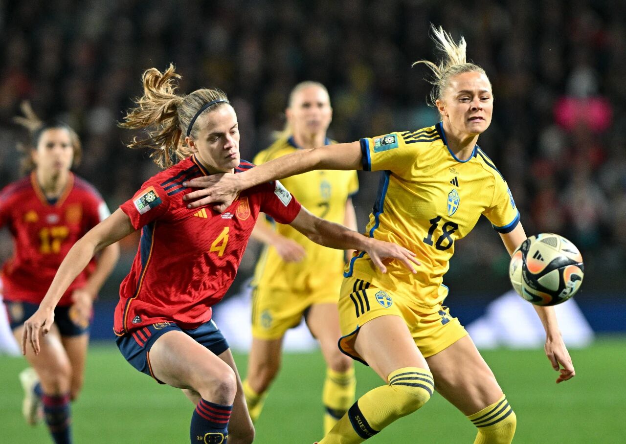 大部分时间平平淡淡的这场2023女足世界杯半决赛,突然在最后10分钟刺刀见红。第81分钟,19岁的替补小将帕拉略洛一脚势大力沉的射门,为西班牙队打破僵局。1:0,西班牙队距离胜利只差毫厘。第88分钟,顽强的瑞典人没有放弃,同样是替补上场的布洛姆奎斯特接到队友头球回传,半侧身打门得手,1:1,比赛眼看将进入加时赛。不料1分钟后,卡蒙娜打出一脚世界波,皮球击中横梁后弹入球门,彻底摧毁了瑞典人的希望,2:1的比分保持到了终场。 8月15日,瑞典队球员罗尔弗(右)与西班牙队球员伊雷妮·帕雷德斯争抢。