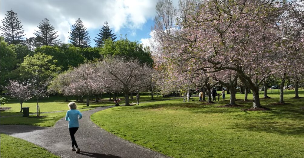 、2024年10月初,一名女子在奥克兰一树山盛开的樱花旁跑步。华页摄影