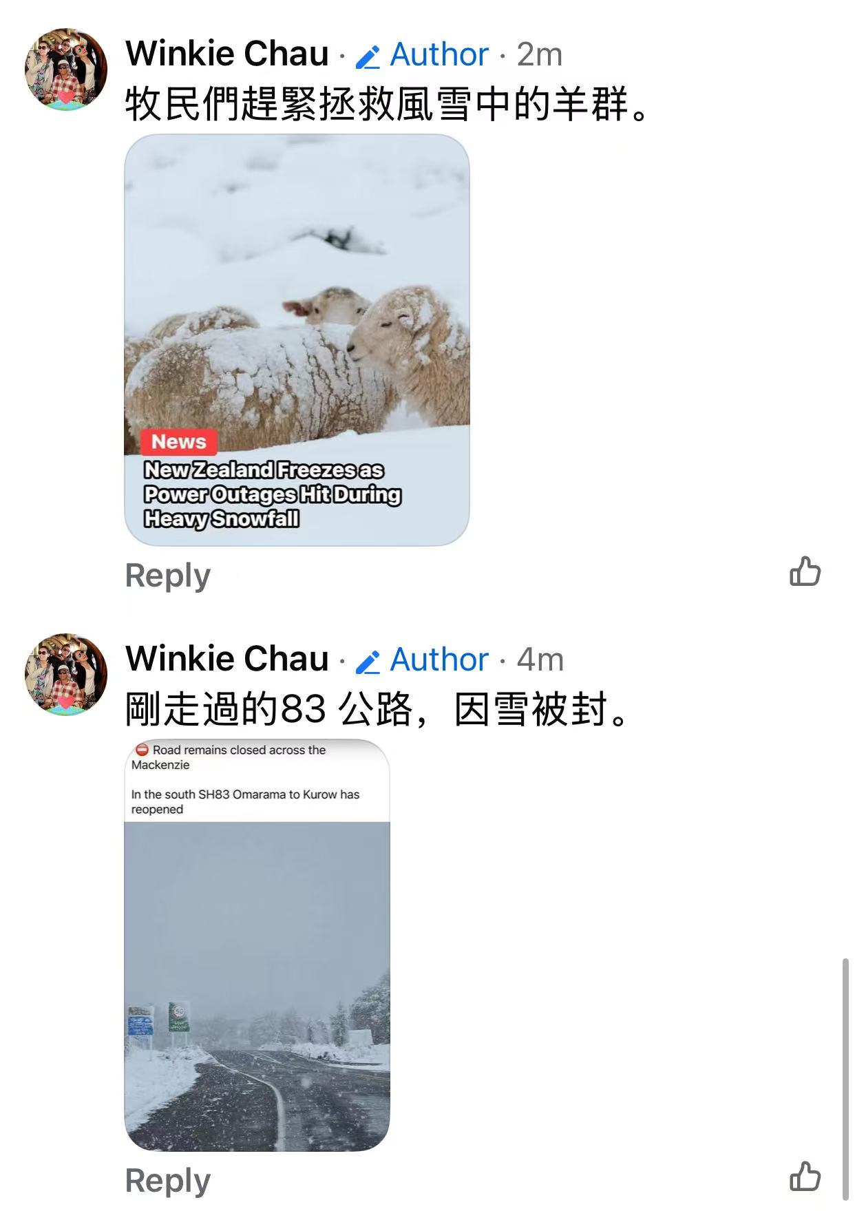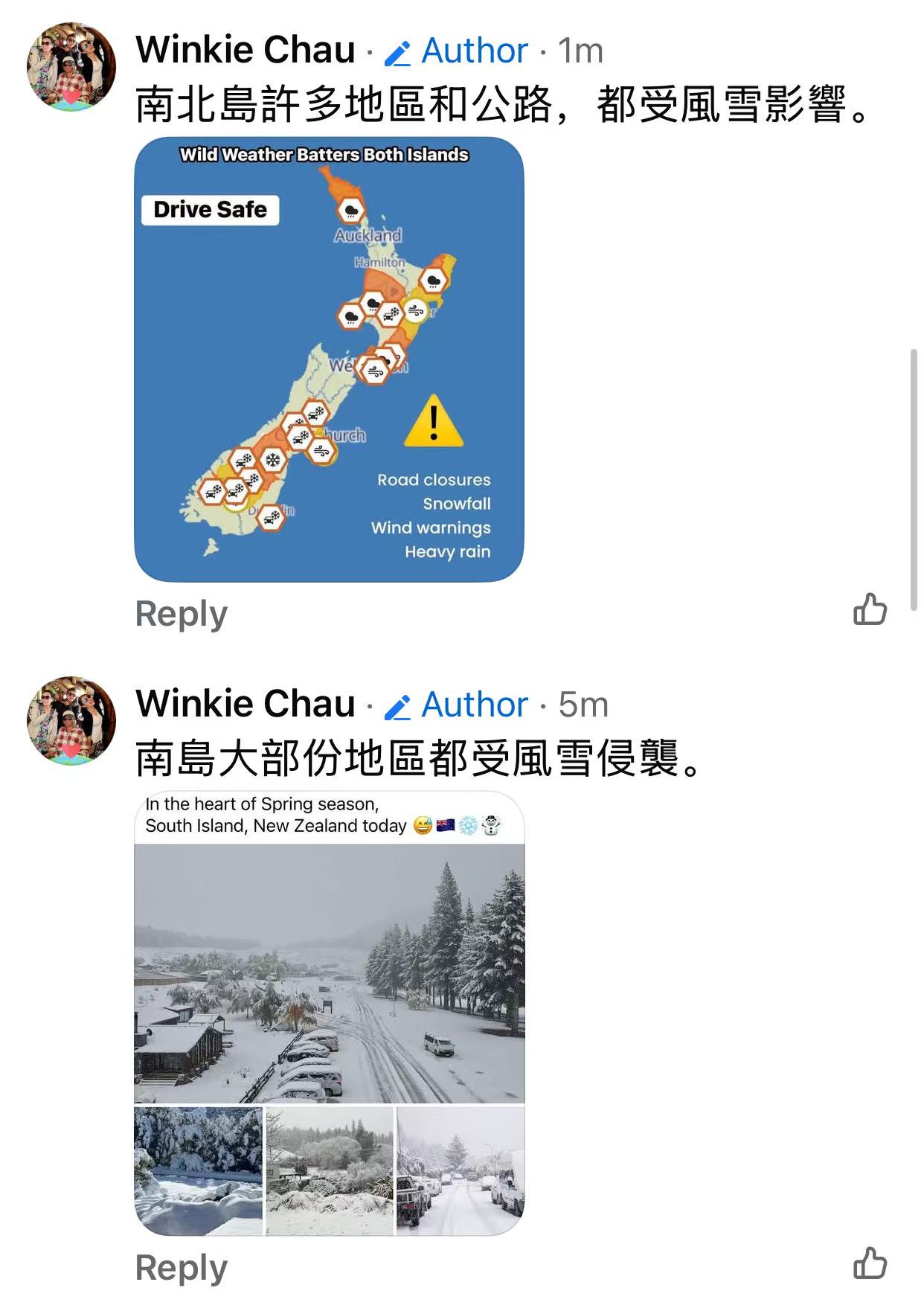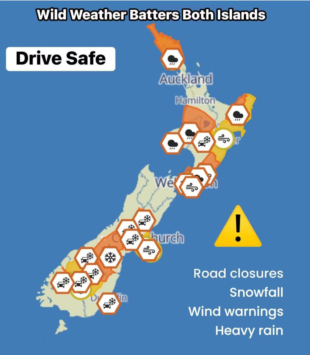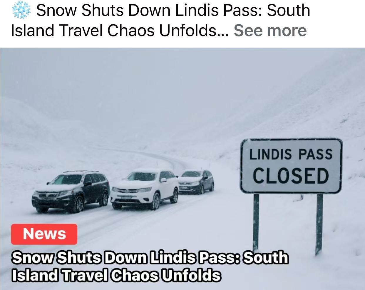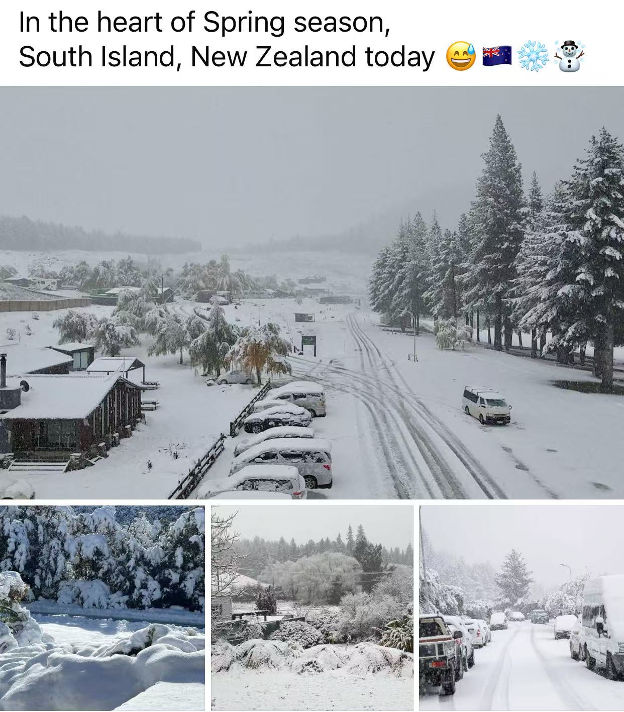 「以圖說事」 兩事皆有新聞時效,但論對大眾影響,首選天氣之乖變,「黃腿大黃蜂」的入侵,暫且按下候表。 早兩週才以「大跌眼鏡,超乎想像」為題,強調《對海外來客言,紐西蘭很多人事是超乎想像,也顛覆預期,尤以天氣一日數變。》事實上,9月同行3人,旅途上確已體驗。只是,他們離開不久的這幾天,紐西蘭尤以南島,大雨狂風加大雪,封路斷電,市民苦不堪言。 氣象服務部門 (MetService) 對全國大部分地區,發布了橙色和黃色警報。從積雪覆蓋的奧塔哥和坎特伯雷山口,到狂風肆虐的首都威靈頓,大自然毫不留情,殘酷地提醒我們,人類何其渺小。 綜合各方消息,暴雨和大雪導致南島很多高山路線關閉,我拍過不少美照的林迪斯山口(Lindis Pass )更是完全關閉,車輛在暴風雪中艱難前進。