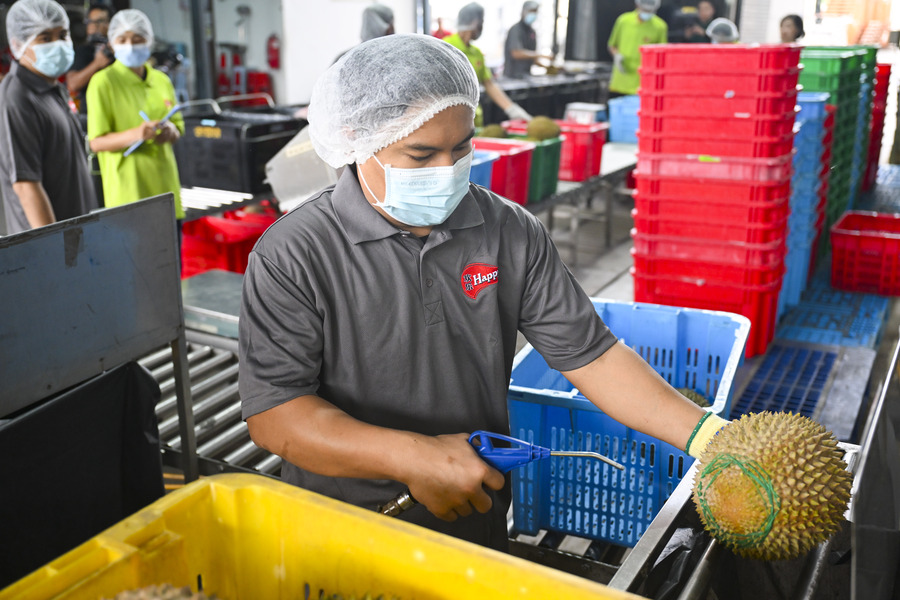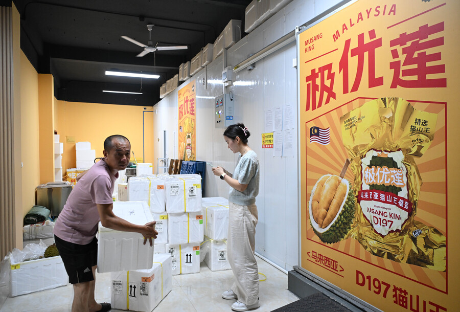 “近年来,马来西亚出口的榴莲超过70%运往中国。”马来西亚国际榴莲产业发展联合会秘书长张健豪介绍说,中国是全球最大榴莲消费市场之一。2011年马来西亚开始向中国出口冷冻榴莲产品,2019年起对华出口冷冻整颗带壳榴莲。2024年,两国签署马来西亚鲜食榴莲输华植物检疫要求议定书,为马来西亚榴莲鲜果输华开启大门。“中国市场不断扩大开放,不仅带动马来西亚榴莲产业出口额增长,也促进了马来西亚榴莲加工、包装、物流领域快速发展。”他说。 在位于雪兰莪州的裕利进出口有限公司榴莲鲜果分拣包装车间内,30余名本地员工在流水线上忙碌作业。鲜果榴莲通过冷鲜厢式货车送达工厂,经过处理后,搭载冷链车直送机场。“通过‘航空冷链+跨境通关’模式,可直达中国广州、上海、深圳等城市,全程最快仅36小时。”公司负责人谢明发说。 10月17日,在广州白云区一家水果经销商的运营中心,工作人员整理刚到货的榴莲鲜果。新华社记者邓华摄