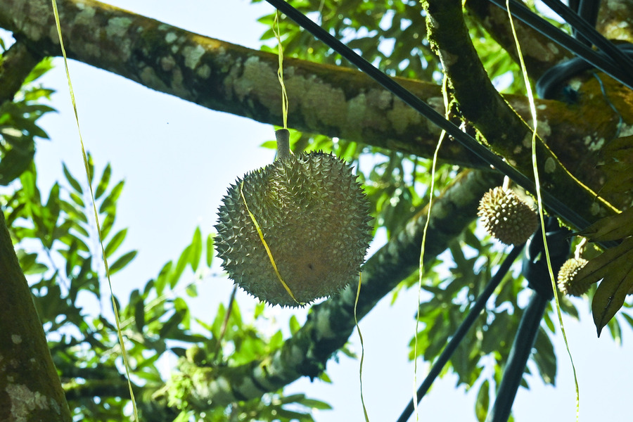 新华社吉隆坡10月28日电(记者王嘉伟 程一恒 毛鹏飞)10月,马来西亚迎来榴莲收获季,“猫山王”“黑刺”“苏丹王”等耳熟能详的榴莲品种次第登场。这个榴莲季,中国食客怎样才能尝到当季最新鲜、果肉诱人、黏喉香醇的榴莲?更密集的中马往返航班、更快捷的跨境物流清关,科技赋能精准分级——这些举措推进了中国市场的榴莲品质升级。 榴莲正在加速“飞”向中国。2024年8月,首架满载鲜食榴莲的航班由中原龙浩航空公司承运抵达郑州机场,开启鲜果榴莲“空中丝路”新旅程。如今,在马来西亚彭亨州劳勿、文冬等榴莲产区,不少果园推出“直达机场”服务,榴莲成熟落地后即刻装箱登机运往中国,“从果树到餐桌”的时间被前所未有地缩短。 这是10月16日在马来西亚彭亨州劳勿拍摄的一颗成熟的猫山王榴莲。新华社记者程一恒摄