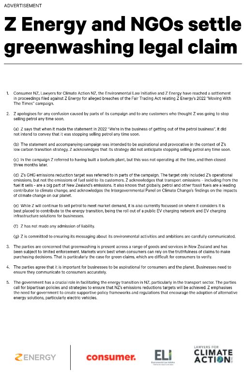 承认问题,呼吁政府行动Z Energy 与原告方在联合声明中一致认为,漂绿在新西兰普遍存在,而监管执法仍十分有限。 Z Energy 承认: