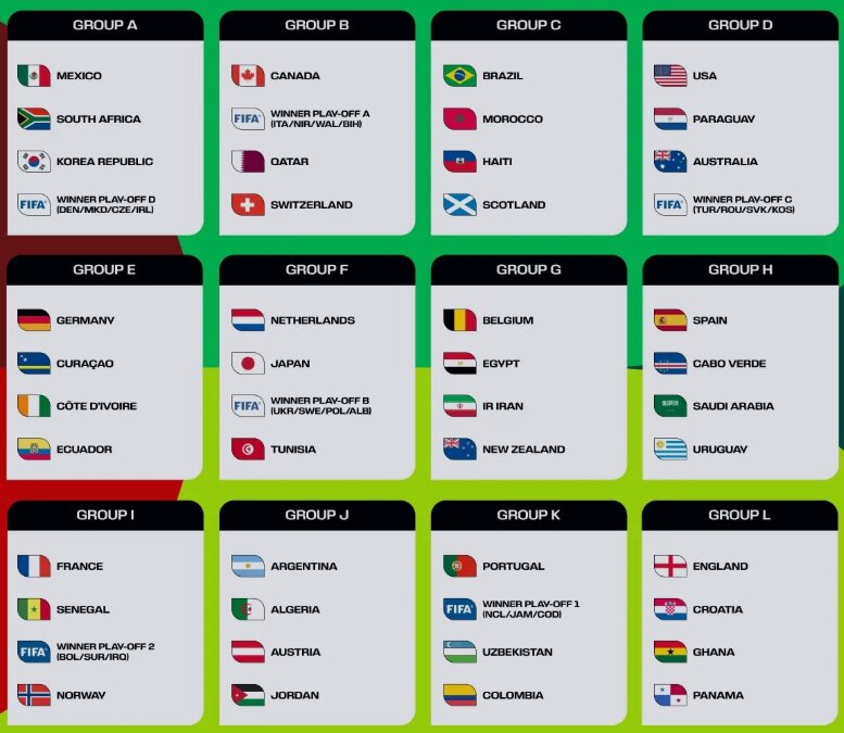 2026年FIFA世界杯™小组及对阵揭晓! 史上规模最大的体育盛事正式进入倒计时 新西兰与比利时、埃及和伊朗在G组。 最终抽签仪式在华盛顿举行2026年FIFA世界杯™(史上最大规模的世界杯)的最终抽签仪式在美国首都华盛顿特区举行。 在约2000名国际嘉宾到场的约翰·F·肯尼迪表演艺术中心,以及全球数百万观众的见证下,本届赛事的**12个小组(每组4队)**正式揭晓。 赛事规模空前:首次出现12个四队小组这次抽签确定了第23届世界杯的全部小组和对阵情况,被认为是具有划时代意义的一届世界杯。想要获取更深入的报道和分析,可访问 FIFA.com。 比赛场地与开球时间公布日期确认明年这届共有 104 场比赛 的超级世界杯,其完整比赛场地与开球时间将于: 12月6日(星期六)美国东部时间 12:00(欧洲中部时间 18:00)通过全球直播节目公布,观众可在 FIFA.com 收看。 热度持续攀升:主办三国已售出近200万张门票随着赛事临近、三大主办国与16座活力城市热度不断升温,世界杯最新赛程的发布将成为通往这场颠覆性足球盛会的又一重要里程碑。 抽签结果A组墨西哥、南非、韩国、欧洲附加赛D B组加拿大、欧洲附加赛A、卡塔尔、瑞士 C组巴西、摩洛哥、海地、苏格兰 D组美国、巴拉圭、澳大利亚、欧洲附加赛C E组德国、库拉索、科特迪瓦、厄瓜多尔 F组荷兰、日本、欧洲附加赛B、突尼斯 G组比利时、埃及、伊朗、新西兰 H组西班牙、佛得角、沙特阿拉伯、乌拉圭 I组法国、塞内加尔、国际足联附加赛2、挪威 J组阿根廷、阿尔及利亚、奥地利、约旦 K组葡萄牙、国际足联附加赛1、乌兹别克斯坦、哥伦比亚 L组英格兰、克罗地亚、加纳、巴拿马 |