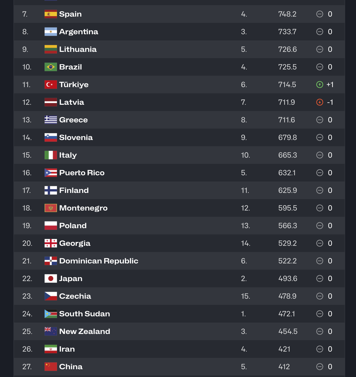 新华社瑞士米村12月4日电(记者单磊)国际篮联4日公布了最新一期世界男篮排名,前十名位置没有任何变化,中国男篮依旧位列第27位。 中国队在最新一期的世界排名中位列第27 本次排名是2027年男篮世界杯预选赛第一窗口期的所有比赛全部结束之后公布的。在这个窗口期,中国男篮两度输给韩国队。韩国队的积分因此有所提升,但对其世界排名帮助不大,仍排在第56位。 亚洲球队中,排名最高的仍然是澳大利亚队(世界排名第六),其次分别为日本队、新西兰队和伊朗队,中国队位列亚洲区第五。 亚洲区球队排名 世界男篮前十名依旧为:美国、德国、塞尔维亚、法国、加拿大、澳大利亚、西班牙、阿根廷、立陶宛和巴西。土耳其超过拉脱维亚升至第11位,拉脱维亚降至第12位。 国际篮联当日同步更新了世预赛球队实力榜,遭遇两连败的中国男篮排名亚洲区实力榜第11位,下滑8位。排名亚洲区实力榜前三位的分别为澳大利亚队、韩国队和日本队。 “尽管如此,也不要指望中国队会长期停留在实力榜的下半区。中国队以及他们的球迷都清楚这支球队巅峰状态时的实力,而这次的失利或许正是推动他们重回最佳状态的契机。”国际篮联在点评中国男篮时表示。 |