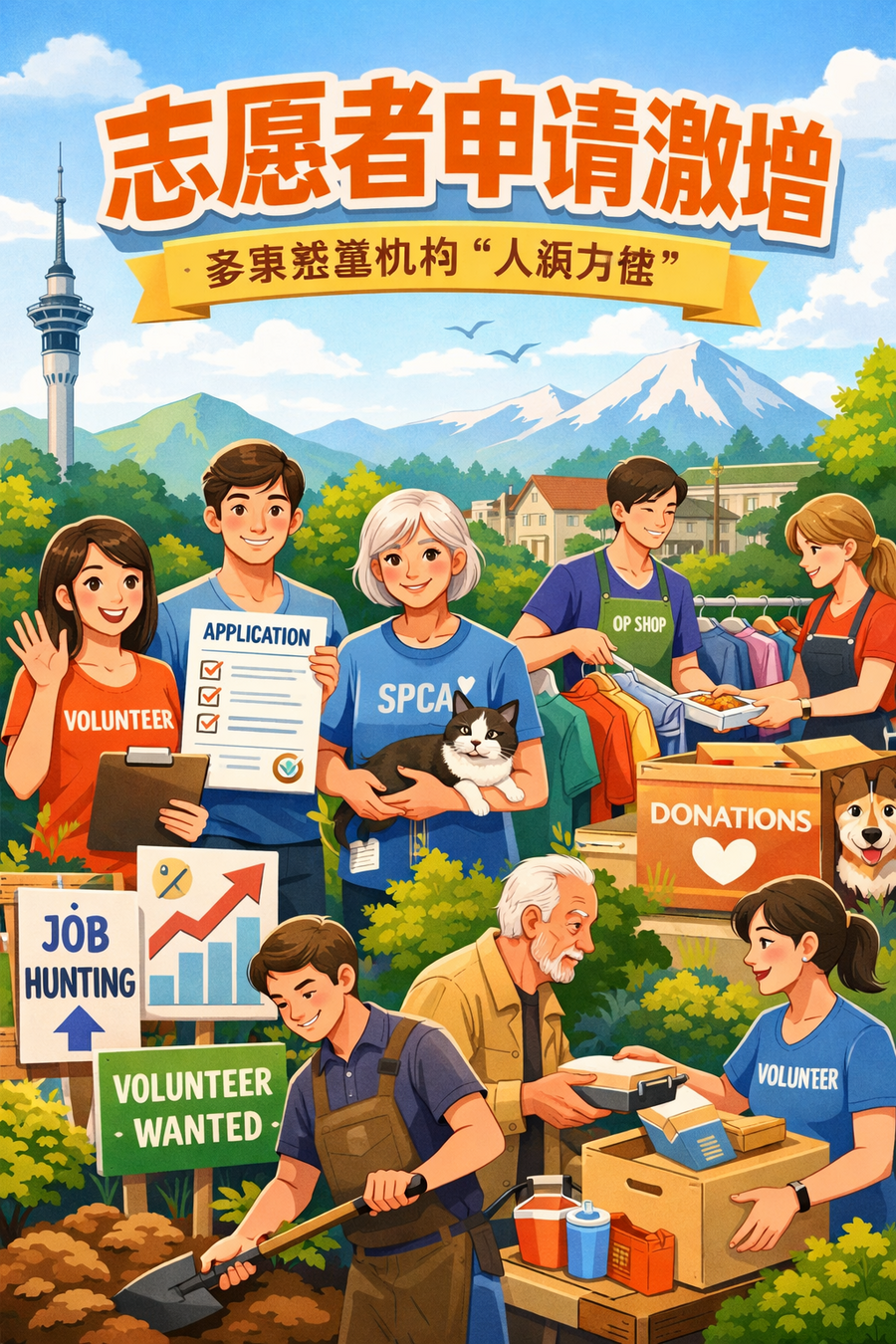 由于志愿者申请人数大幅上升,新西兰多家慈善机构不得不拒绝不少希望参与志愿服务的人士。机构表示,这一现象与失业率持续走高密切相关。 华页AI制图 与此同时,一些企业在招聘有薪岗位时收到成千上万份求职申请,不少求职者在等待工作机会的过程中,选择通过志愿服务来积累经验。 志愿服务申请显著增加倡议组织 Volunteering NZ 一直在跟踪相关趋势。其发言人 Margaret McLachlan 表示,过去一年,各类慈善机构的志愿岗位申请数量明显上升。 不少志愿者申请表都会询问申请者是否正在找工作。