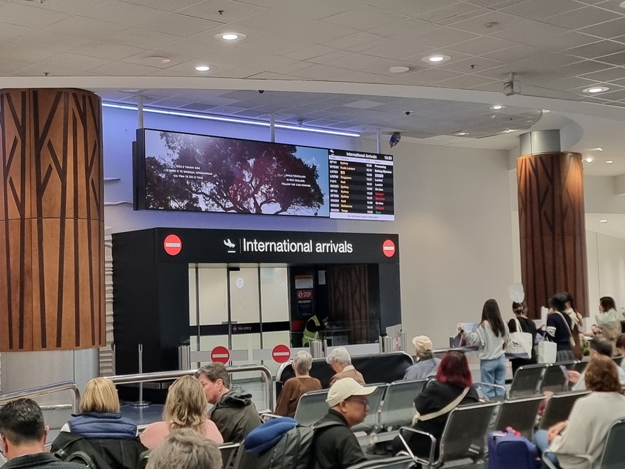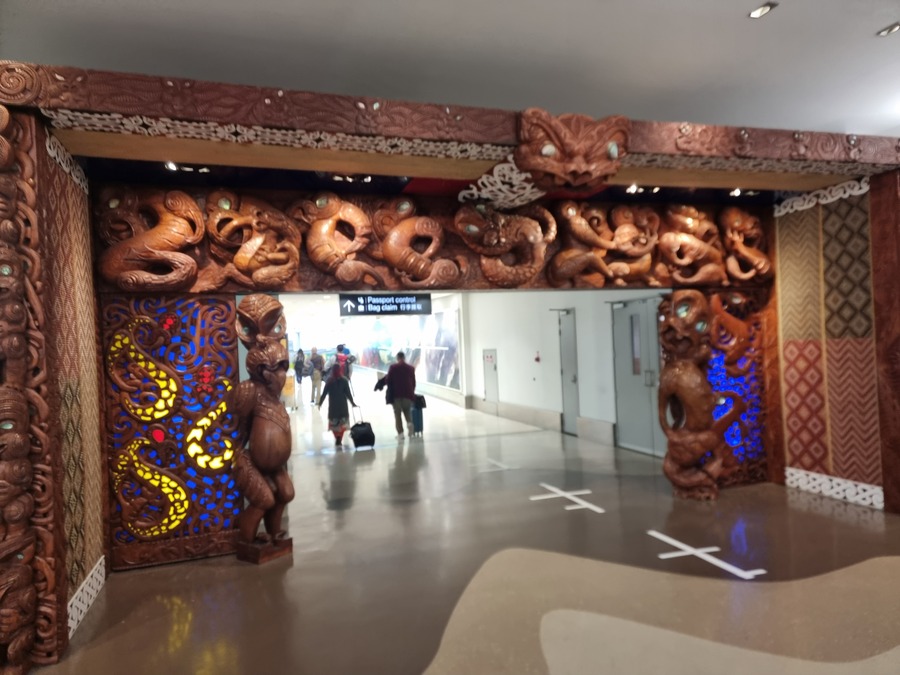 奥克兰国际机场旅客抵达后必经毛利雕塑大门。华页摄影