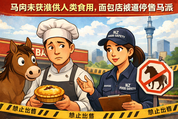 所用马肉未获准供人类食用,相关部门介入调查 近日,奥克兰一家面包店因所使用的马肉未符合新西兰食品安全规定,被迫停止出售一款广受欢迎的马肉派。 Lo'i hoosi 是一道传统以马肉作为主要食材的汤加美食,市政府发现马肉不符合供人类食用的规定后禁止面包店出售。华页AI制图 马肉派一度爆红圣诞节前,Pakuranga Bakery 推出了一款名为 lo'i hoosi 的马肉派,并在其 Instagram 页面上进行宣传。 Lo'i hoosi 是一道传统的汤加美食,以马肉作为主要食材。这款派推出后迅速走红,在社交媒体上收获大量好评,成为店内热门产品。 投诉引发检查上周,《First Up》首次联系 Pakuranga Bakery 时,店方已确认停止出售该产品。 奥克兰市议会专业运营、许可及环境健康经理 Veronica Lee-Thompson 随后说明,市议会在收到投诉后派出检查人员进行调查。 她表示,检查发现面包店所使用的马肉并非来自注册供应商,因此不符合供人类食用的规定。 主动配合,现场销毁Lee-Thompson 指出,经营者在检查过程中表现非常配合,同意当场销毁: