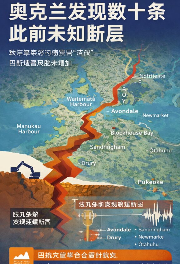 奥克兰发现数十条此前未知断层 科学家将挖沟调查是否“活跃”,目前地震风险未增加近日,研究人员在奥克兰地下发现了数十条此前未知的地质断层。科学家计划在未来展开进一步调查,以确认这些断层是否仍然活跃,以及是否可能引发地震。目前的研究结果显示,这一发现并未增加奥克兰现有的地震风险。 科学家将挖4米深探沟研究断层参与研究的科学家之一、James Muirhead(奥克兰大学高级讲师)表示,研究团队将很快开始在部分断层上挖掘探沟,以判断这些断层是否仍然活跃。 根据地质学标准,在过去12.5万年内发生过移动的断层通常被认为是“活跃断层”。 研究人员计划在疑似断层处挖掘约4米深的沟槽,通过分析地下沉积层的变化,判断这些断层最近一次活动发生在什么时候。 Muirhead 表示: