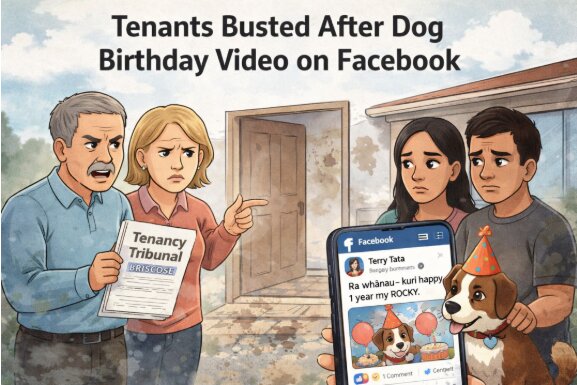 Terry Tata 和 Natasha Wilson 曾告诉房东,他们只养猫。但一段公开的脸书视频却揭穿了他们的说法——视频显示这对情侣正在为他们的狗 Rocky 庆祝一岁生日。 被禁止养狗的房客在脸书发布为狗狗庆祝生日视频被房东发现。华页 AI制图 屋内弥漫的狗尿味和狗的气味也证实了房东的怀疑。气味严重到地毯不得不更换,这进一步说明租客在租住期间养过狗。 如今,房东 David 和 Elizabeth Briscoe 已把他们告到 Tenancy Tribunal(租赁仲裁庭),理由是租客没有如实告知养狗,并且把房子弄得“非常恶心”。 根据最近公布的仲裁裁决,房东当时只允许租客养猫,但不允许养狗。在房屋检查时,房东曾怀疑屋里有狗,但认为狗可能被藏起来了。 Elizabeth Briscoe 说,2025年1月在安排修理车库门时,Wilson 不小心发短信说她要去接 “Rocky下班”。 当房东询问短信是什么意思时,Wilson 回复说 Rocky 是她的猫,并且要带它去看兽医。 但房东随后在 Tata 的 Facebook 公开页面上找到了证据:一段为 Rocky 庆祝一岁生日的照片视频,标题写着: “Ra whānau – kuri happy 1 year my ROCKY” 照片显示 Rocky 在房子里面。 Wilson 和 Tata 自 2020年 起租住该房屋。 房屋检查发现问题在 2024年底的房屋检查中,Briscoe 夫妇发现房屋不像以前那么干净。 他们建议租客如果无法保持清洁,可以雇清洁公司。 但当 2025年租约结束时,Wilson 和 Tata 声称他们已经把房子打扫到 “非常干净” 的状态。 房东却告诉仲裁庭,房子看起来 根本没有被清洁过。 他们雇的退租清洁人员发短信说: 房子和地毯 有非常强烈的狗味,墙壁上还有 狗尿喷溅留下的黄色痕迹。 房东随后决定在 2025年把房屋挂牌出售。 一名房地产经纪人在声明中说: