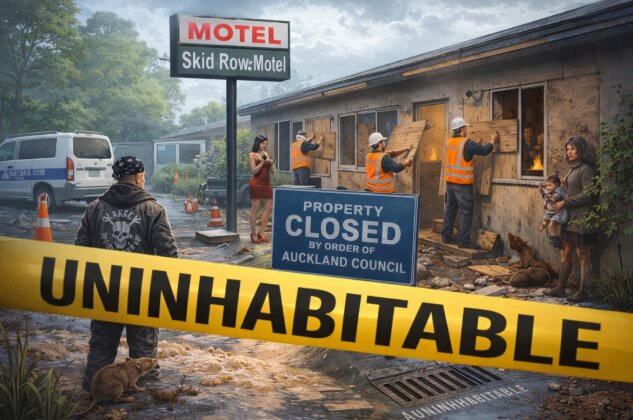 “连狗都不该住”:政府资助租客竟住环境恶劣的“垃圾堆” 奥克兰 Manurewa 一家汽车旅因环境恶劣,被违反《物业维护与滋扰条2015》, 被奥克兰市议会下令将其全面封闭(boarded up)。华页AI制图 奥克兰 Manurewa 一家汽车旅馆(Gateway Motel)因环境恶劣,被形容为: “根本不适合人居住”。 该旅馆原本安置政府资助租客,但却被曝: