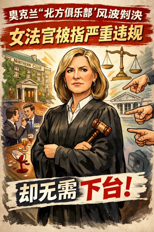 一项行为审查小组裁定,奥克兰高端社交场所“北方俱乐部”(Northern Club)发生的事件中,法官艾玛·艾特肯(Ema Aitken)在2024年的行为构成“严重违反司法分寸(comity)”,但小组最终决定不将其撤职,仍保留其地区法院法官职务。 俱乐部风波裁决行为未达“不当行为高门槛” 涉事法官保留要职。华页AI制图司法部长保罗·戈德史密斯(Paul Goldsmith)表示,由法官和律师组成的司法行为小组认为,撤除艾特肯的职务并不合理。 事件背景2024年11月,艾特肯卷入一起备受关注的“冲突事件”(fracas),事件涉及新西兰优先党(NZ First)在奥克兰北方俱乐部的一场活动。 事件随后被提交法院审理,艾特肯被指控在该俱乐部活动中扰乱NZ First的活动秩序。 调查结果司法行为小组指出: