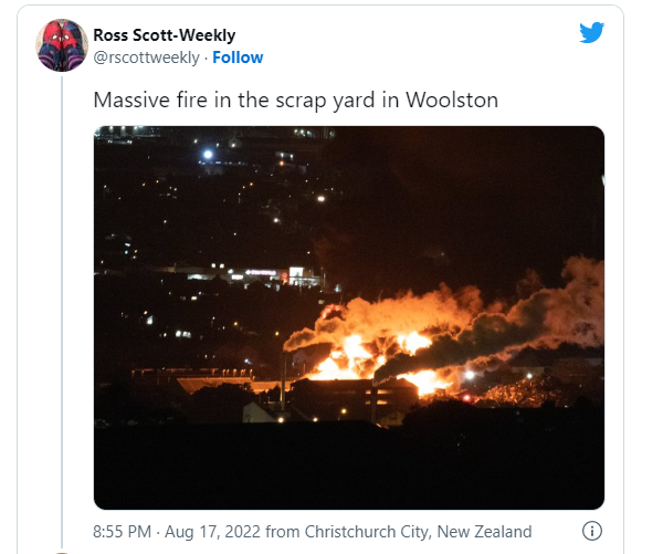 周三晚上开始在基督城一废金属场发生的一场壮观的大火目前已经得到控制,但今天早上仍在燃烧。 图片来源:RNZ / Jean Edwards 晚上8点左右,大火席卷了基督城东部郊区Woolston的一个废铁场,导致爆炸和浓烟持续数小时。 消防和应急部门表示,他们接到了汽车起火的报告,随后立即赶往现场。 据信,发生火灾的是废钢企业National Steel。 居民们在社交媒体上发布了大火的图片。 昨晚向受烟雾影响的人们发出了公共卫生警告。建议他们关闭门窗,不要外出。 图片来源:RNZ / Jean Edwards 助理消防指挥官Dave Key表示,大火已经被控制住,尽管它仍然产生很多烟雾,但火势并不大。 Key说,大火最严重的时候非常壮观,许多居民都赶到现场观看。 火势最猛烈时,有15台消防设备和50名消防员赶到现场。 他估计火警和紧急救援会在那里待上一整天。 Key说,虽然一些人被疏散,但没有私人财产受到损坏。 企业附近的街道已经关闭,尽管人们希望在当天晚些时候减少警戒线。 图文来源:RNZ |